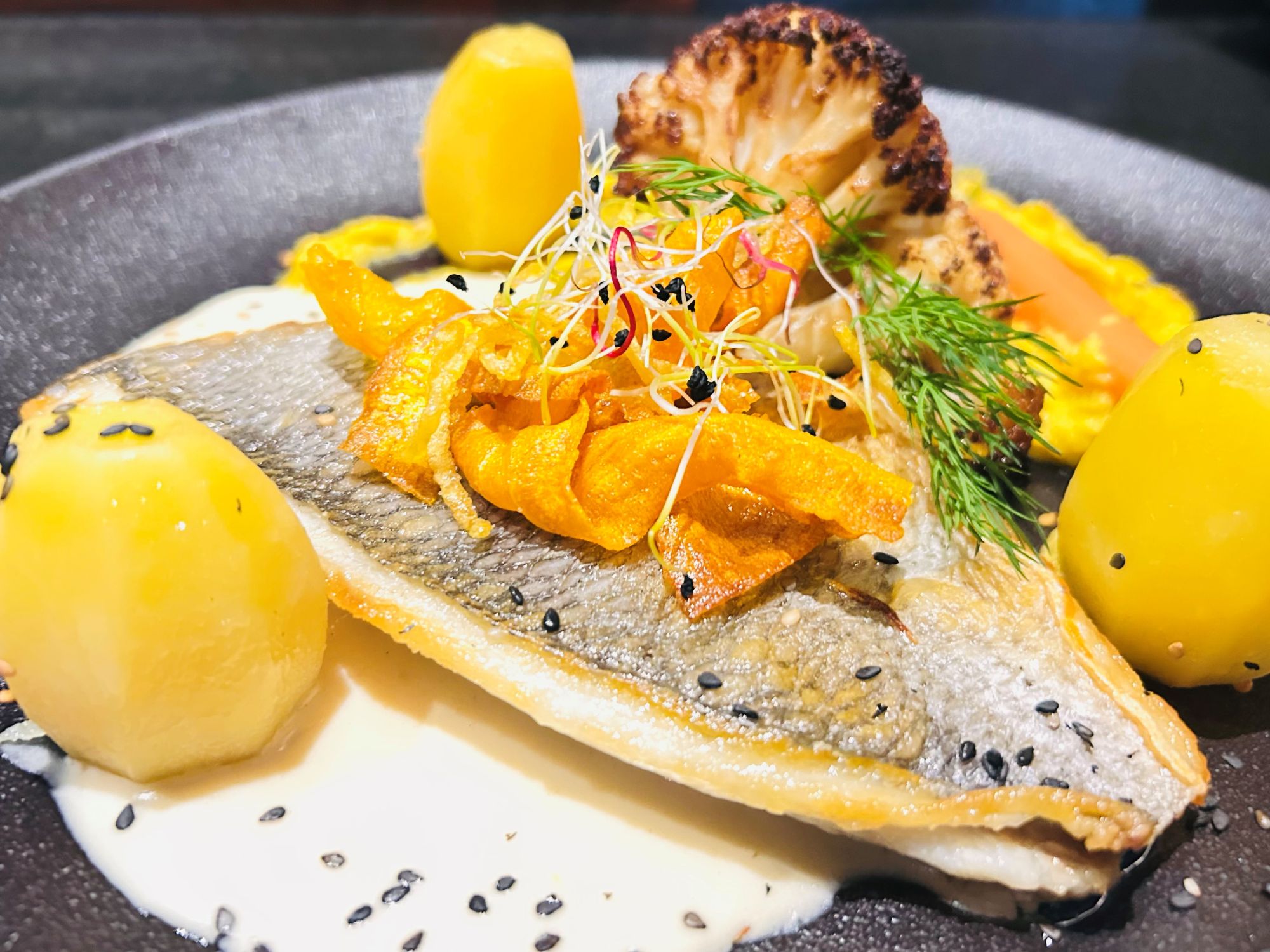 Roasted sea bream fillet, carrot purée, roasted cauliflower, lemon sauce with Timut pepper