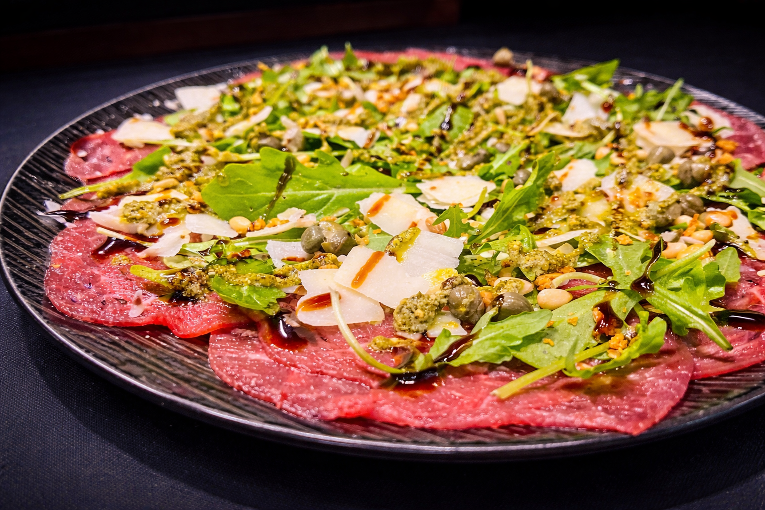 Carpaccio de bœuf Charolais, sauce au basilic, câpres, parmesan, roquette et frites